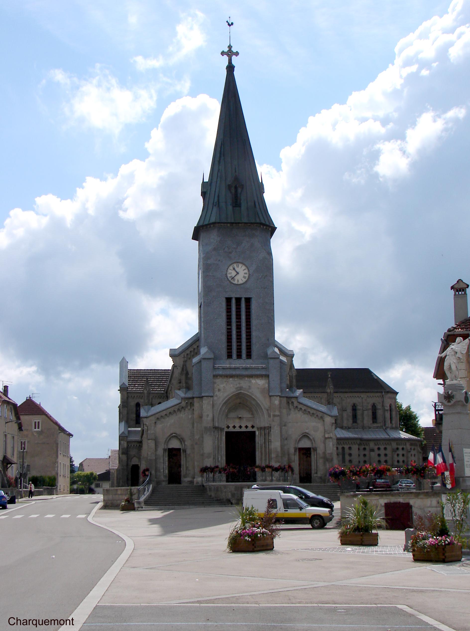 L’église de Charquemont fut agrandie dans les années 1 932, sont clochers qui à l’origine étais un clocher « Comtois » laisse la place à une flèche.