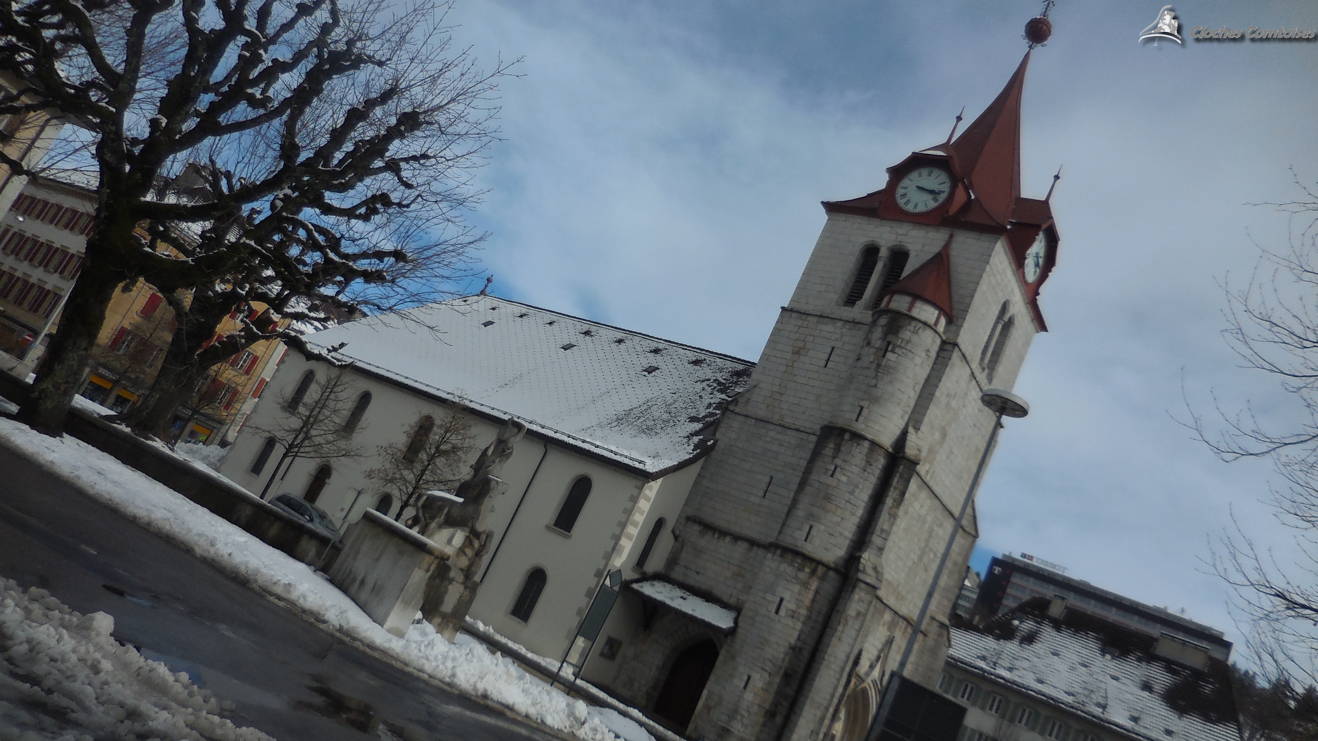 L’imposante silhouette que celle du clocher du temple du Locle. Bâti en 1525, le « Vieux Moutier » sur cette photo.