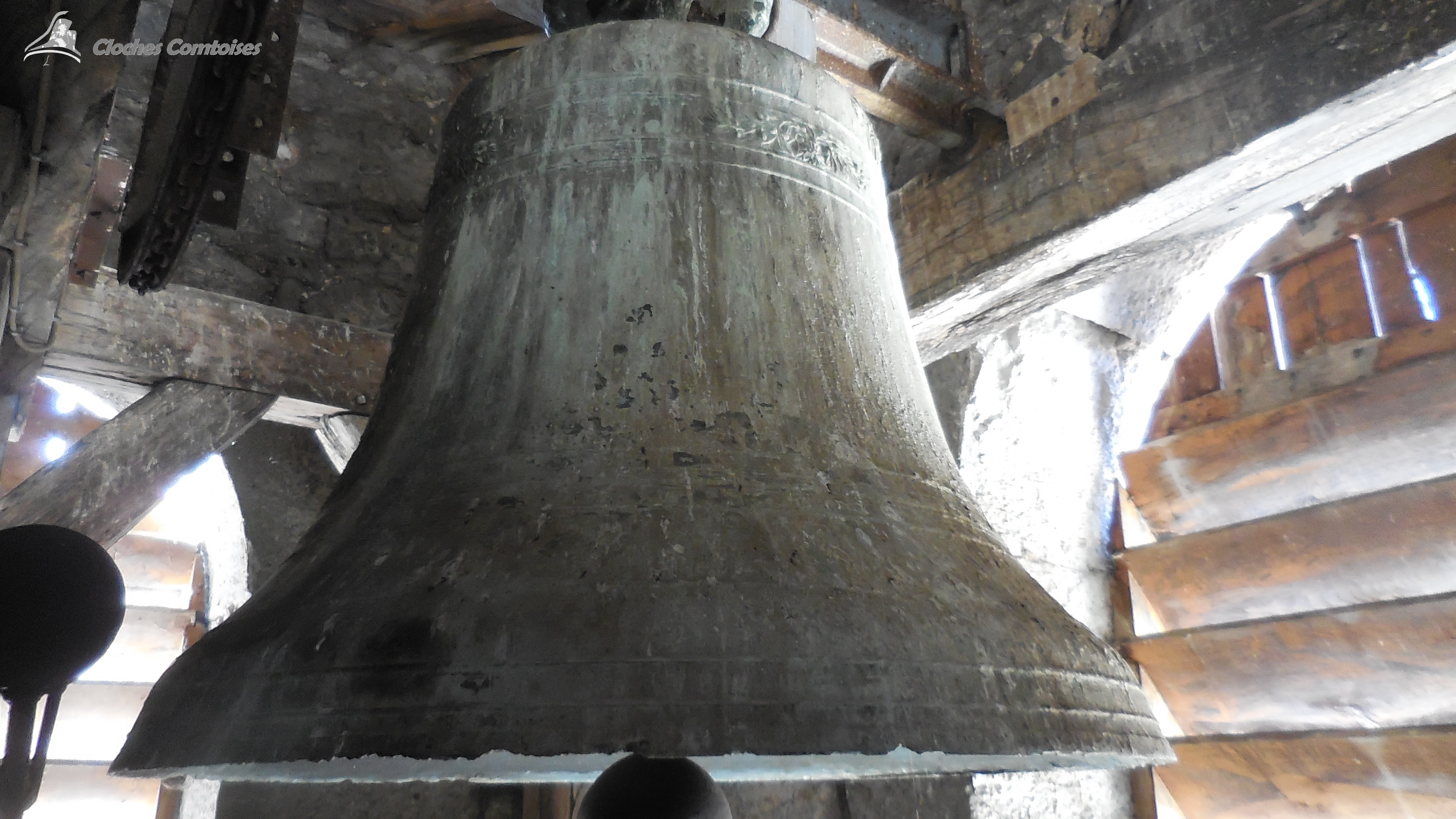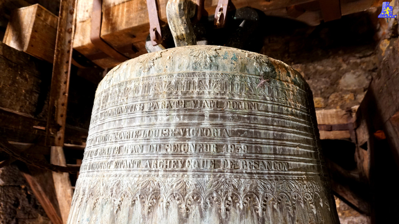 La sonnerie de Lods se compose de deux cloches, tout d’abord, je tiens à rappeler que, lors de mon passage, la plus petite des deux cloches s’était fêlée, quelques semaines avant ma venue, il s’agissait d’une cloche du célèbre fondeur comtois Bournez, nommée joliment « Constance », cette cloche avait été fondue en 1 824 et sonnait tous les angélus, et les tintements. Cette cloche a, et je félicite tous les acteurs pour ce projet mené à terme, été refondue par les ateliers Paccard en juin 2 018. Paccard a bien fait les choses puisque c’est exactement la même note, mêmes mensurations ( à 1 mm près) et le même poids (au kilo près) que l’ancienne cloche! Cette belle cloche dorée, se nomme Jacqueline-Yolande.